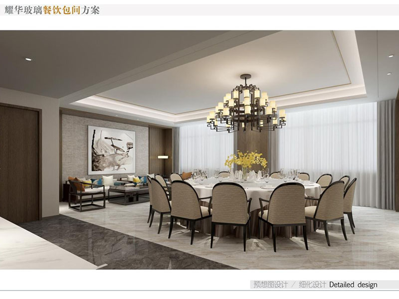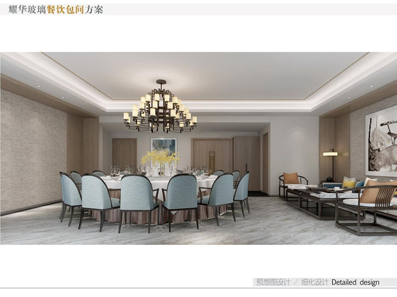 設計理念: 耀華玻璃餐飲包間裝修效果將現代與雅致的風格混搭。包間內采用柔和的燈光與精致的裝飾,營造出溫馨舒適的用餐氛圍。墻面選用高質量的裝飾玻璃,既美觀又實用,同時展現了耀華玻璃的產品特色,為顧客提供愉悅的用餐體驗。
