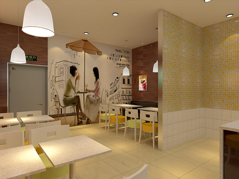 設計理念: 濟南奶茶店甜品店裝修設計-芒果主題飲吧裝修效果溫馨而甜蜜,以暖色調為主,營造出浪漫氛圍。店內燈光柔和,照亮每一款精致甜品與飲品,令人垂涎欲滴。墻面裝飾甜蜜主題貼紙,增添趣味性。座位區布局舒適,適合朋友小聚或情侶約會,營造輕松愉悅的用餐體驗。整體設計既符合年輕人的審美,又充滿甜蜜幸福感。