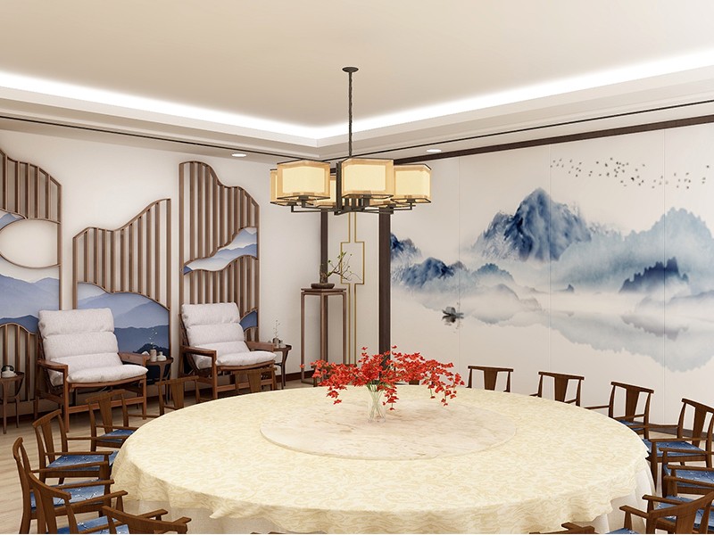 設計理念: ??中鐵二十一局集團軌道交通工程有限公司員工餐廳裝修設計施工以自然、溫馨為主題,整體色調偏暖色,營造出一種舒適愉悅的用餐環境。店內運用了中式風格作為裝飾,展現出具有古老文化質樸的氛圍。使用柔和的照明設計,如暖色調的吊燈,更是為用餐環境增添了一份溫馨感。